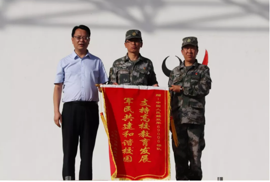 学院党委副书记、副院长阳东升为承训部队赠送锦旗,表达了对承训教官衷心的感谢和诚挚的敬意。