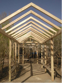 14村党员捐木料,村里的3名木工自己施工建的凉亭框架已成型,后续工作还在继续。