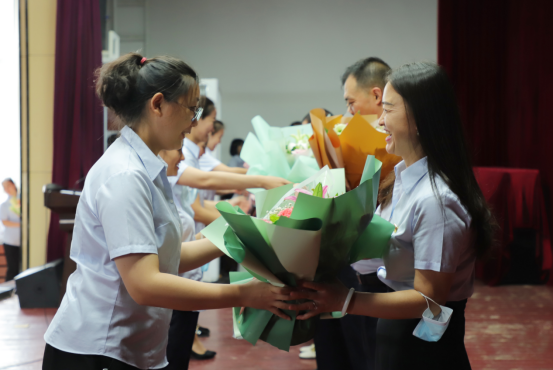青年教师向导师献花,导师回礼。