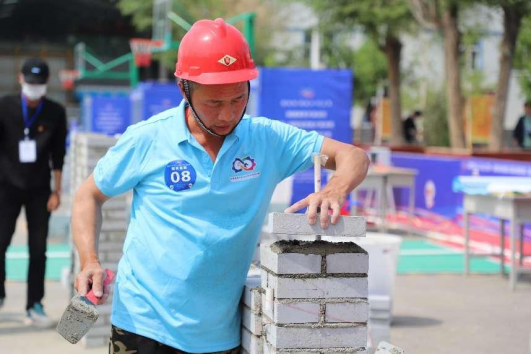 在新疆建设技师培训学院篮球场上,3400平方米的赛场上32个工位整齐排开,比赛用砖整齐码放,切割机、瓦刀、胶皮盆、图纸等砌筑用具一应俱全。“这次参赛选手覆盖范围很广,年龄跨度也很大,成人组的选手年龄最大的已经57岁了。”新疆建设技师培训学院砌筑赛场裁判助理彭茹说。