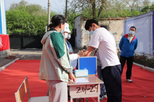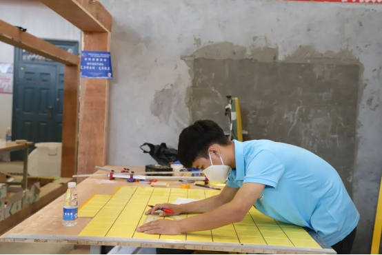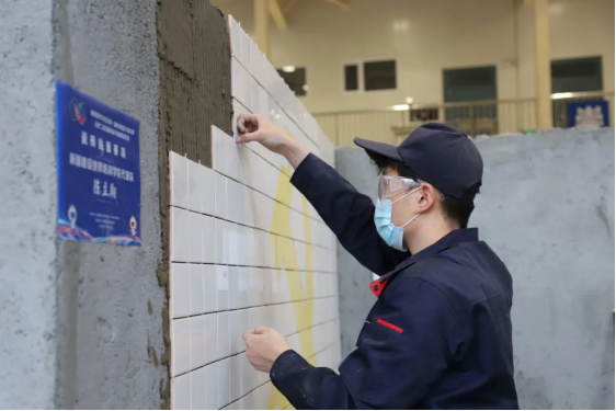 我院的陈立翔和阿里木·买买提参加了这个项目的比赛。瓷砖贴面项目要求选手在7小时内将白色方块瓷砖贴到墙面,其中要嵌入红色“2023”字样瓷砖和黄色党徽图案瓷砖,瓷砖的造型切割和贴面皆由选手独立完成。这一技术广泛应用于家庭和公共设施的装修,就业前景广阔。今年大三的陈立翔已经在企业实习,他通过层层选拔,最终代表学院参赛,他的测量尺上写着“如果成功有捷径那就是踏实勤奋”。瓷砖贴面是一个考验体力耐力的项目,陈立翔和同伴每天都“泡”在实训室,他说学校的后勤保障让参赛选手没有后顾之忧,切割的锯齿、瓷砖价格都不便宜,但是他们从来没有为这个操过心。