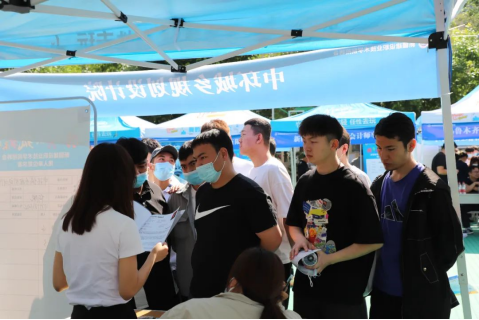 当天阳光明媚,花红草绿,音乐喷泉在“跳舞”,招聘会现场人头攒动,毕业生们拿着精心准备好的简历接踵而至,在各企业展位间穿梭,认真研究企业招聘简章,表达求职意向,并主动向企业展示自己的综合能力。