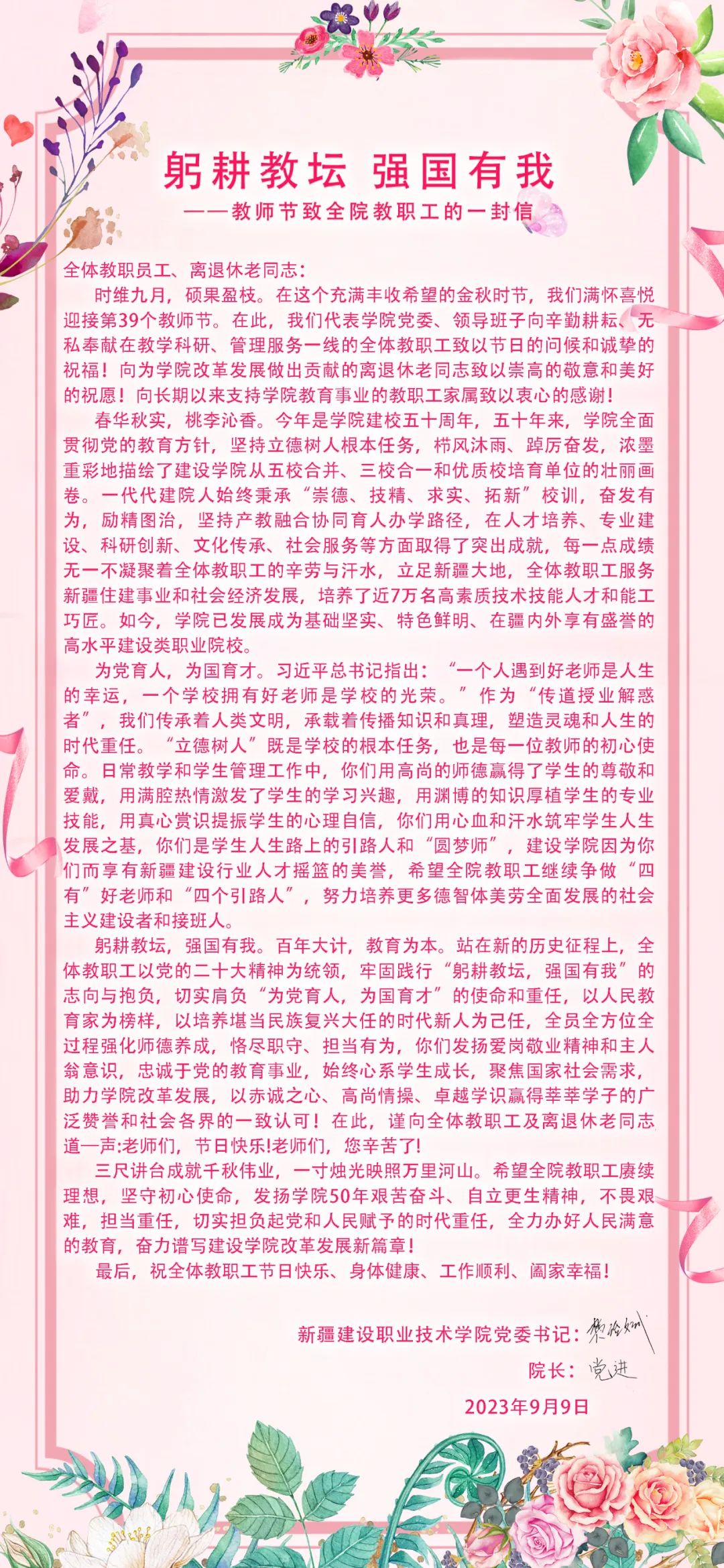 躬耕教坛 强国有我——教师节致全院教职工的一封信
