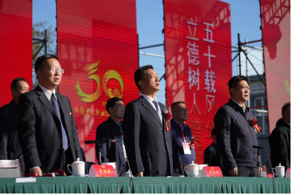 上午10时30分, 学院庆祝建校50周年大会隆重召开,全体起立,奏唱中华人民共和国国歌。