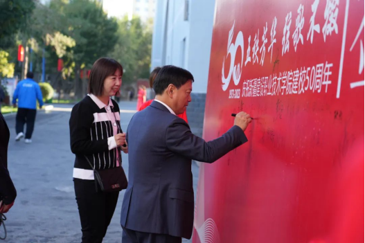 当天的校园,草木葳蕤、万物并秀、其乐融融,被热烈红、建筑蓝装扮得端庄秀丽、光彩照人,饱含祝福的“50”字样,各类鲜花装点着校园的每一个角落,签名墙上留下一个个滚烫的名字,汇成热烈的涌动和深深的祝福。