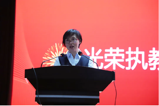 “光荣执教”30年教师代表信息管理学院熊秀丽老师发言。她用真诚的语言回顾三十年的从教历程,彰显着作为教师的担当与责任。她表示,时光虽已远去,但她们将会继续发挥余热,献出自己的光和热,为学院的教育事业继续努力,添砖加瓦,再创辉煌!