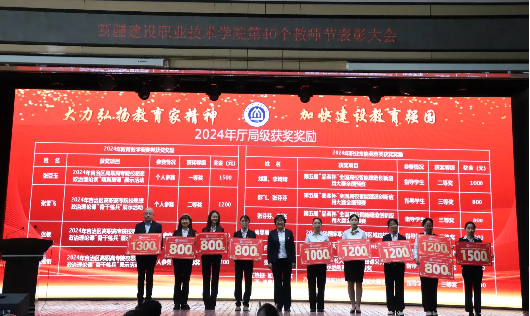 伴随着雄浑有力的国歌声响起,大会拉开帷幕。会上,学院党委副书记、院长党进宣读《关于表彰2023年度先进个人的决定》,党委副书记、副院长马桂珍宣读《关于表彰2023年度先进党支部和优秀共产党员的决定》,党委委员、副院长吴冶宣读《关于表彰2023年度党风廉政先进部门的决定》,党委副书记、副院长谢克热提·夏吾开提宣读《关于表彰2023-2024学年优秀班主任的决定》,副院长余冬贞宣读《关于表彰奖励2024年师生各类竞赛获奖的决定》,党委委员、副院长吴冶宣读《关于表彰光荣从事教育教学工作30年教职工的决定》。教师们依次走上主席台,学院领导为先进集体和个人颁奖。