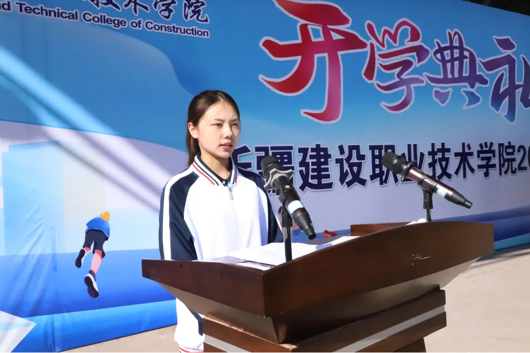 建筑设备工程学院张奕轩代表新生暨军训学员代表发言。表示在军训期间要严守纪律、刻苦训练、努力完成各项军训任务,不懈攀登、勇于拼搏,努力成长为有理想、敢担当、能吃苦、肯奋斗的时代新人。