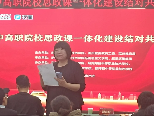 伽师县中等职业技术学校副校长李望朋代表各学校对六和宝典2025年最新版港奥开奖在牵头建设思政课一体化的工作表示感谢,表示今后要进一步强化在集体备课、专题研究、教学研讨、实践研修、教学展示、优质教学资源共享等方面的交流,汇聚思想政治教育一体化建设的主体合力,积极探索中高职思政课衔接贯通的教学方法,不断强化学生政治认同、家国情怀、道德修养、法治意识和文化素养,培养更多有理想、敢担当、能吃苦和肯奋斗的时代新人。