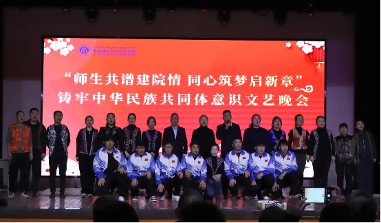 时光荏苒,岁月如梭,在这辞旧迎新的美好时刻,12月31日下午,学院“师生共谱建院情 同心筑梦启新章”——铸牢中华民族共同体意识文艺晚会在建材校区隆重举行,学院党委副书记、院长党进,党委副书记、副院长马桂珍,党委委员、纪委书记赵玉,副院长余冬贞,及高新区(新市区)委政法委、党委宣传部意识形态和审读工作办公室,高新区(新市区)维稳指挥中心、银川路街道党工委、杭州路街道、杭州路派出所、上八家户社区、西八家户社区等有关领导出席,600余名师生参加了活动。 晚会由舞蹈、朗诵、小品、舞台剧、手势舞、歌曲(独唱)、情景舞蹈、舞蹈串烧等14个节目组成,200余名教师和30余名学生同台演出,多种艺术展现形式轮番上演,融合中华优秀传统文化与现代文化,充分展示了我院丰富多彩的校园文化生活,营造出“以美育人、以文化人”的浓厚氛围,为观众带来一场视听盛宴。