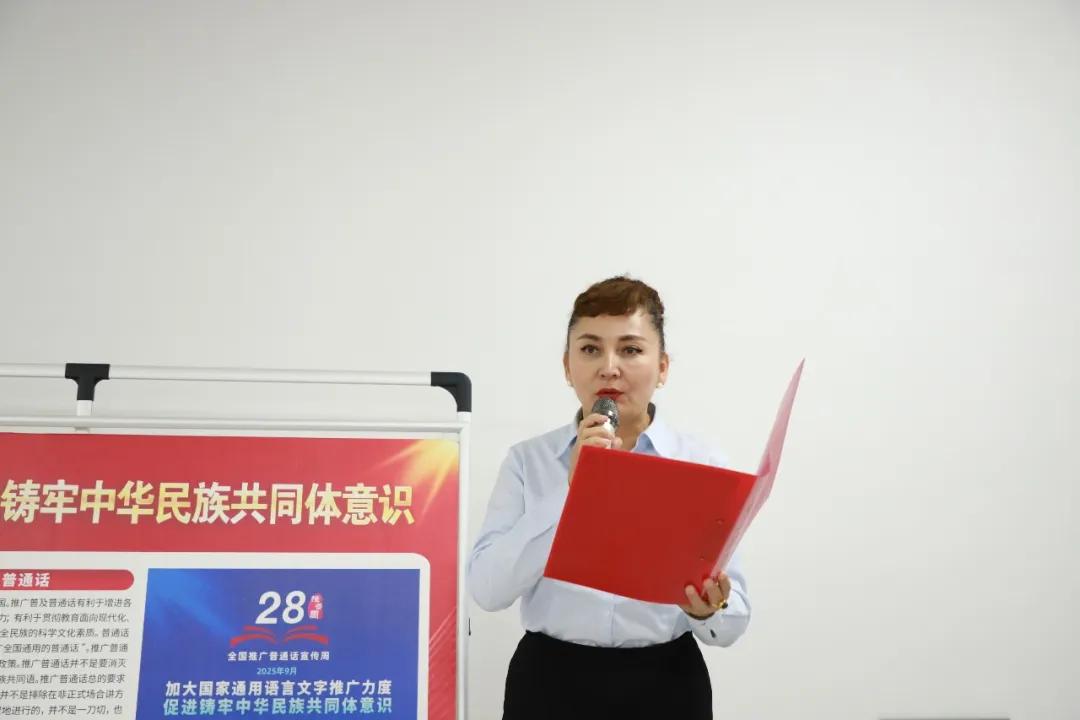 学院党委委员、副院长马桂珍首先发表讲话。她强调,大力推广和规范使用国家通用语言文字,是关系国家统一、民族团结、经济发展、文化复兴和社会进步的基础性工程。它有利于消除语言隔阂,促进社会交往,更为重要的是,它是铸牢中华民族共同体意识的重要途径。一口标准的普通话,传递的是共同的乡音与国情,构建的是共有的精神家园,能够极大地增强全体中华儿女的文化认同和民族凝聚力,让“中华民族一家亲,同心共筑中国梦”的理念更加深入人心。