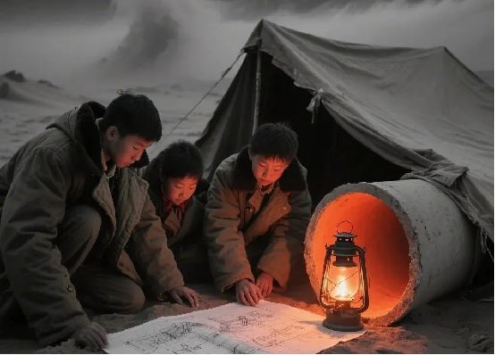 沙尘暴撕扯着帐篷的深夜,煤油灯在水泥管里摇曳出橙红的光晕,师生们裹紧军大衣,将施工图纸映成一片星河。煤油灯芯爆开的火花与经纬仪上融化的冰霜,在零下二十度的夜色里交相闪烁。天山脚下每一块砖石都烙着“手脑并用”的誓言,那是荒原上永不熄灭的星火,是匠人以身躯为灯盏点燃的曙光。